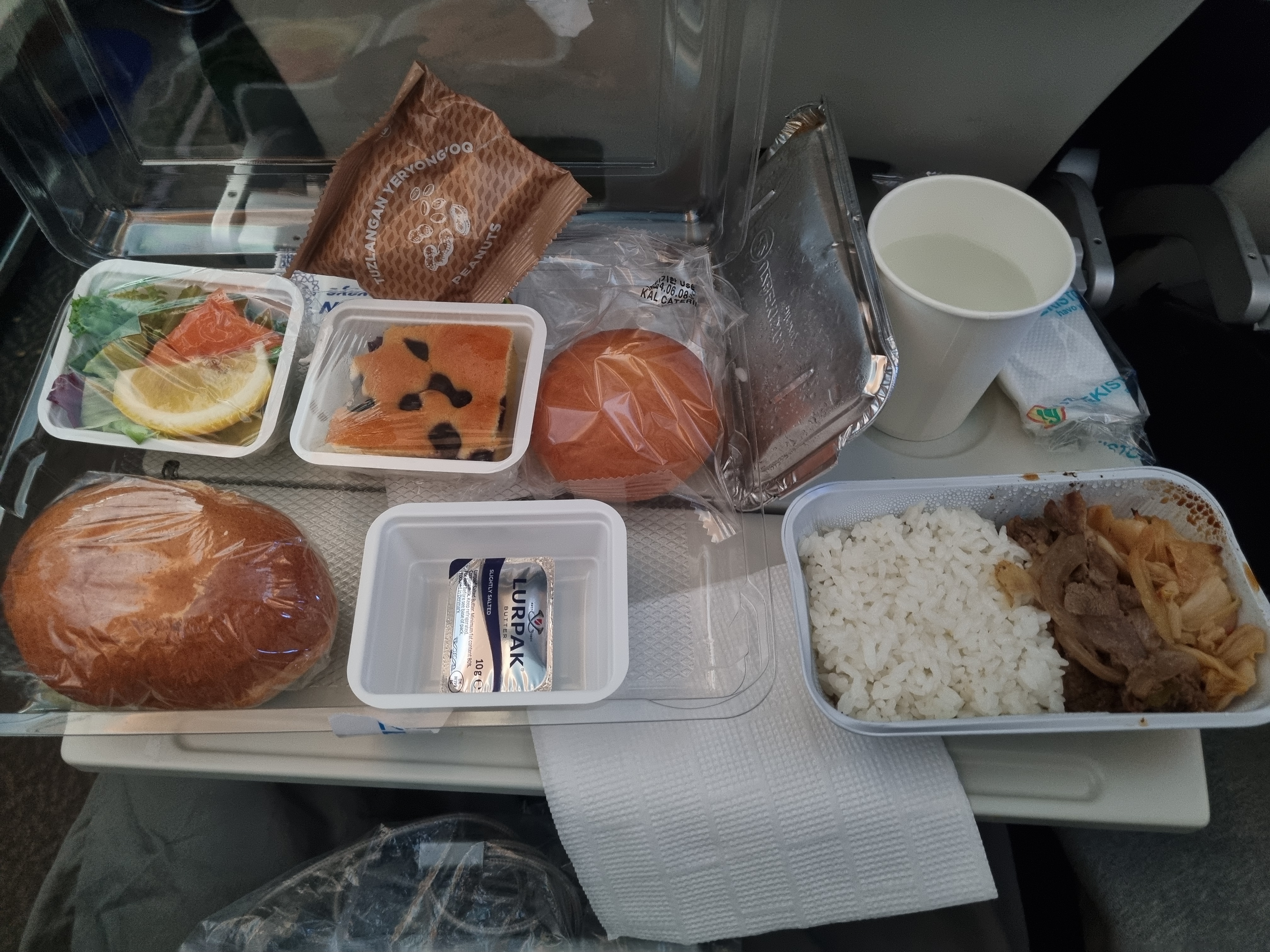 비프로 받은 기내식입니다. 일단 소불고기맛의 한국식 불고기(조금 고기냄새는 있었지만 갠찮음), 샌드위치, 모닝빵, 버터, 연어샐러드, 블루베리케익이 있었습니다. 엄청 양이 많더라구요