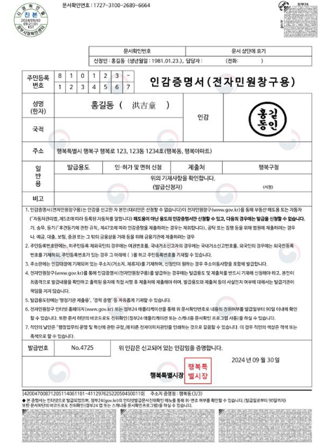 전자민원창구용(온라인) 인감증명서 발급 샘플