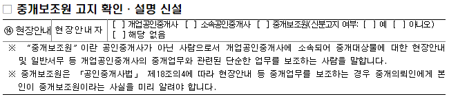 ㅇ 중개보조원이 현장안내를 할 경우에는 중개의뢰인에게 본인이 중개보조원이라는 사실을 알려야 하며, 공인중개사는 중개대상물 확인․설명서에 중개보조원의 신분고지 여부를 표기하여야 한다.