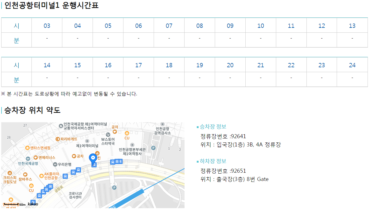인천공항터미널1 운행 시간표 및 승하차장 위치 약도