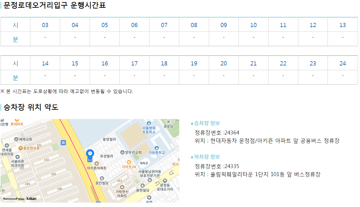 1) 승차장 정보: 정류장번호 24364, 현대자동차 문정점/아키죤 아파트 앞 공용버스 정류장