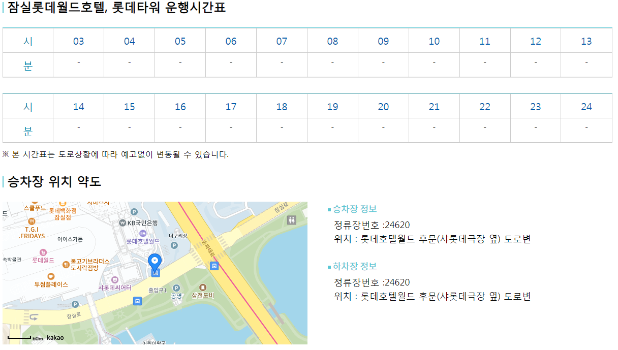 2) 하차장 정보: 정류장번호 24620, 롯데호텔월드 후문(샤롯데극장 옆) 도로변