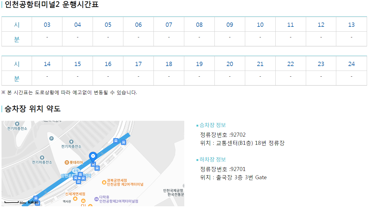 인천공항터미널2 운행시간표 및 승하차장 위치 약도