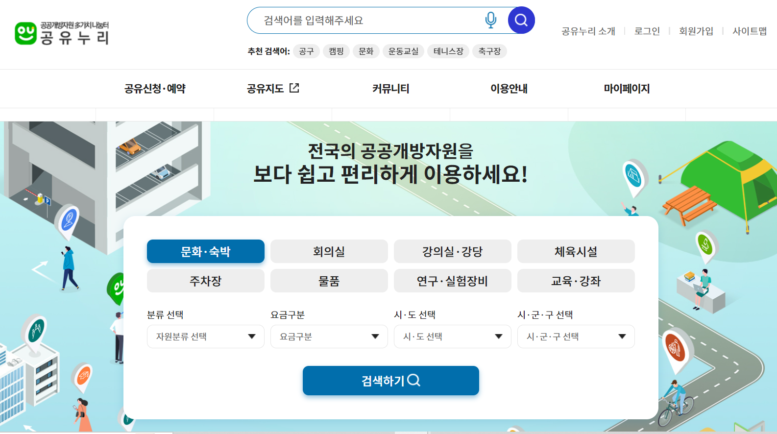 공유누리란 국가에서 개방하는 공공시설, 물품 등 공공개방자원을 쉽고 편리하게 예약할 수 있는 누리집입니다.