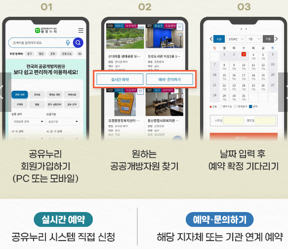 공유누리란 국가에서 개방하는 공공시설, 물품 등 공공개방자원을 쉽고 편리하게 예약할 수 있는 누리집입니다.