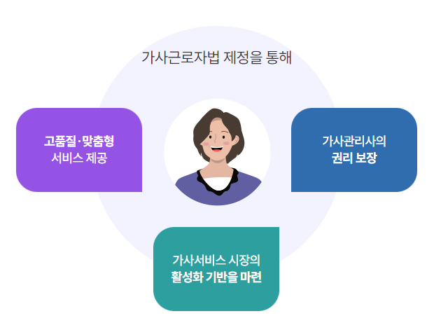 가사노동이 저출산, 고령화 추세에 점차 시장화되고 경제활동이 늘면서 가사서비스 시장수요가 증가하고 있습니다. 가사서비스가 대부분 직업소개소나 사인을 매개로 한 비공식 영역에 머물러있어 품질 보증과 가사관리사의 보호를 위하여 가사근로자의 고용개선에 관한 법률이 2022년 6월 16일 시행되었습니다