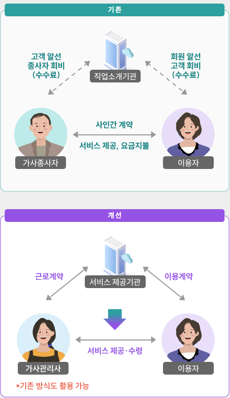 정부가 인증한 가사서비스 제공기관이 가사서비를 직접 고용하고 가사서비스 이용자와 이용계약 체결하여 관련 서비스 제공