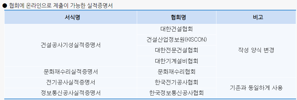- 각 실적증명서는 협회에 한 번만 제출 가능하며, 협회 제출 후 제출된 내용을 업체에서 임의로 수정 및 삭제 불가함