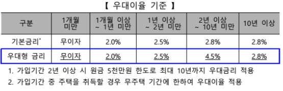 일반 주택청약종합저축 이율에 1.7%p 가산(무주택기간만큼 적용)