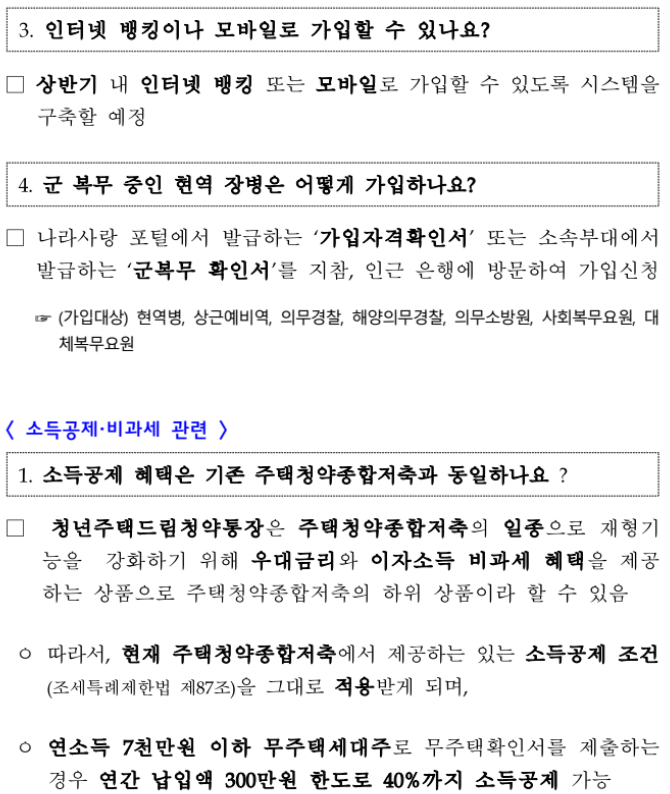 * (현역장병의 경우) 위 요건에 해당하거나, 현역복무확인서, 장병내일준비적금가입자격 확인서 등을 통해 현역복무 중이 확인되는 경우 가입가능(다만 직전년도 사업, 기타소득 합이 5천만원 이하여야함)