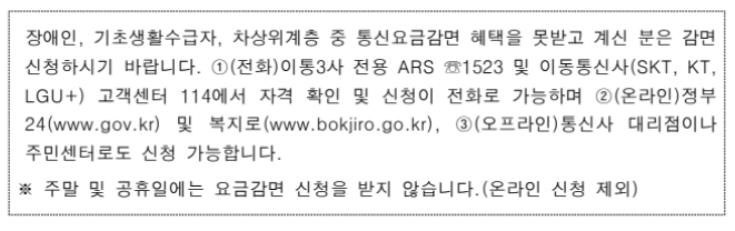 2023년 11월 15일부터 기초생활수급자, 장애인 등 취약계층 대상 통신요금 감면제도에 대해 문자(SMS)에 안내한다고 합니다.