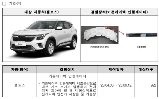 셀토스 922대는 커튼에어백 인플레이터(전기적 신호로부터 가스를 방출시켜 에어백을 부풀게 하는 장치) 제조불량으로 2024.1.10.부터 시정조치에 들어갑니다.