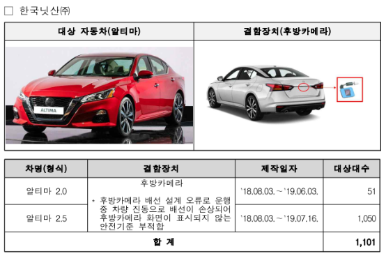 알티마2.0 등 2개 차종 1,101대는 후방카메라 화면이 표시되지 않는 안전기준 부적합으로 2024.1.2.부터 시정조치를 진행합니다.