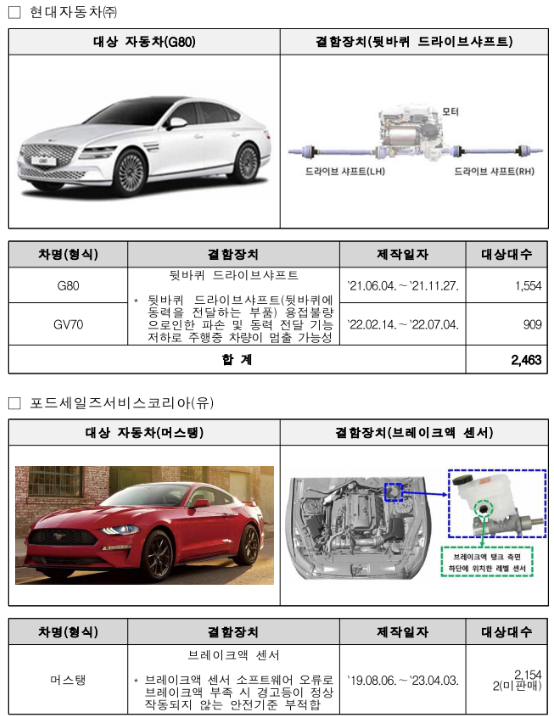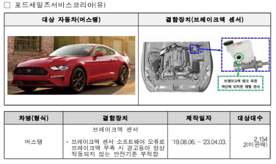 머스탱 2,156대는 브레이크액 부족시 경고등이 정상 작동되지 않는 안전기준 부적합으로 2024.1.10.부터 리콜에 들어갑니다.