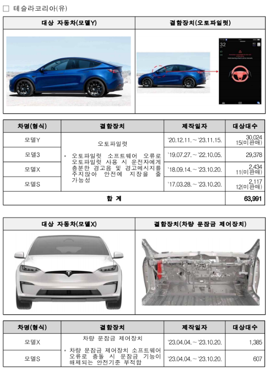 모델Y 등 4개 차종 63,991대는 오토파일럿(차량을 자동으로 조향, 가속 및 제동할 수 있게 도와주는 주행 보조장치) 소프트 웨어 오류로 모델X 등 2개 차종 1,992대는 충돌 시 차량 문잠금 기능이 해제되는 안전기준 부적합으로 리콜에 들어갑니다.