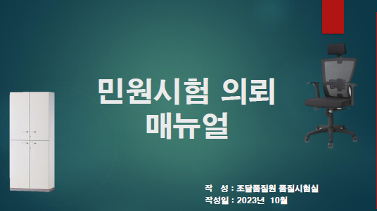 조달품질원 품질시험실 민원시험 의뢰 가이드, 매뉴얼, 주의사항, 품명별 시험항목 및 수수료 자료를 아래와 같이 공지하였습니다. 품짏시험실 이화학 시험 이용관련 내용을 확인하여 주시기 바랍니다.