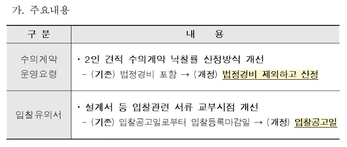 국가를 당사자로 하는 계약 관련하여 기획재정부는 계약예규를 개편하였습니다. 기획재정부는 협상계약 낙찰하한율 상향, 입찰자의 서류 제출 부담 완화 등의 개선사항을 반영하여 계약예규를