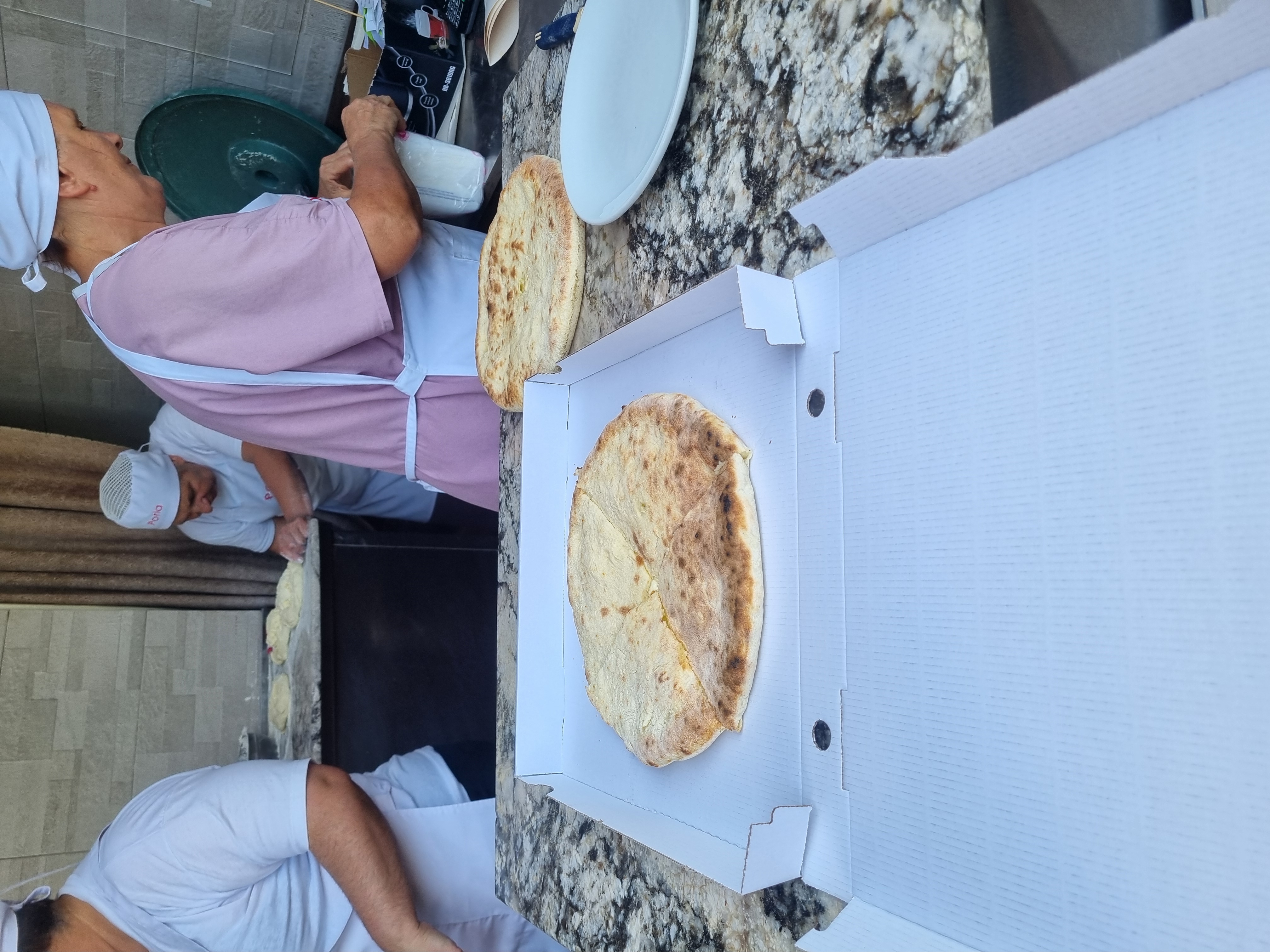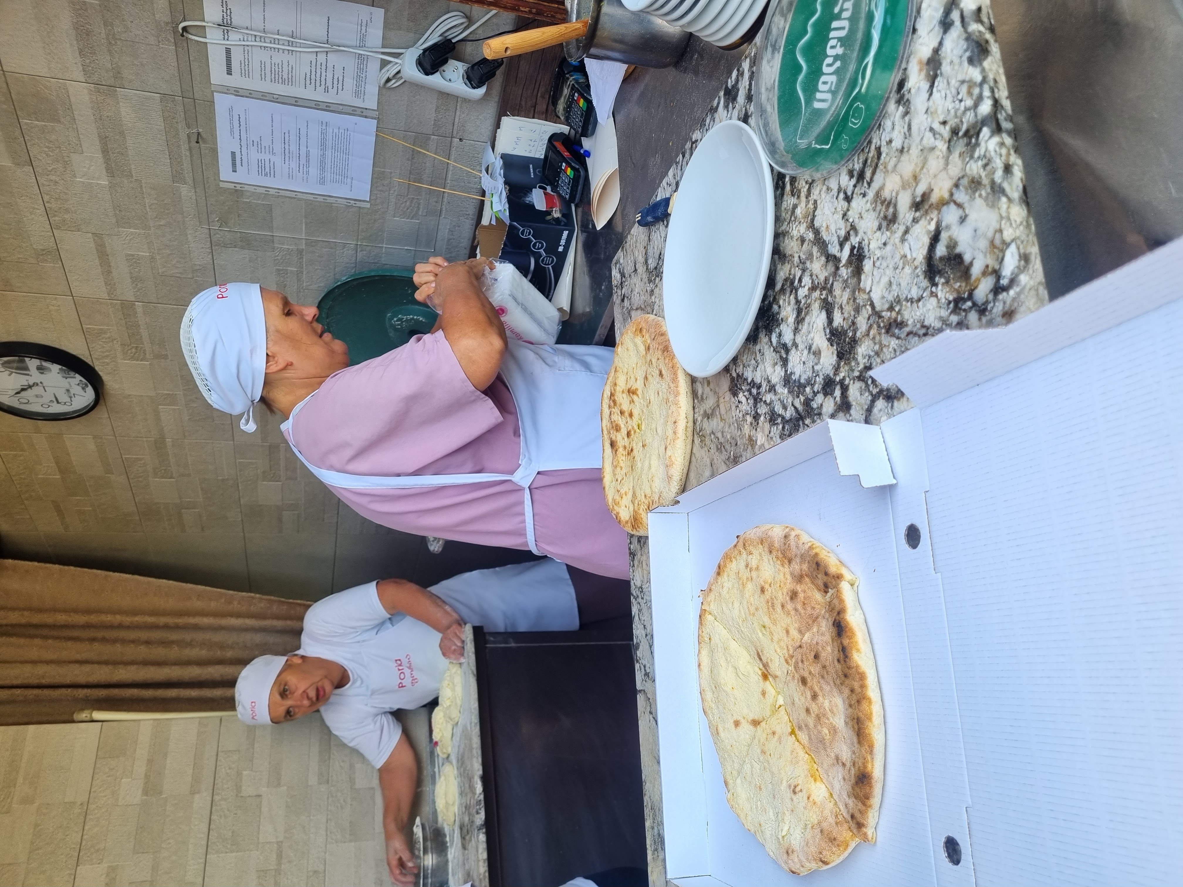 할머니들께서 직접 반죽을 하시고 카드결제도 가능합니다. 바로바로 뜨근한 하차푸리피자를 먹을수 있다니 기대됩니다.앞사람분들이 마 세네판씩 주문해가셔서 저희가 좀 많이 기다렸네요 30분정도 기다렸더것같아요 포장으 여기서 결제하세요아 그리고 포장박스값은 따로 받아서 제 기억상 6.5라리 정도 줬던것같습니다.너무너무 마싯게 보이지않나요