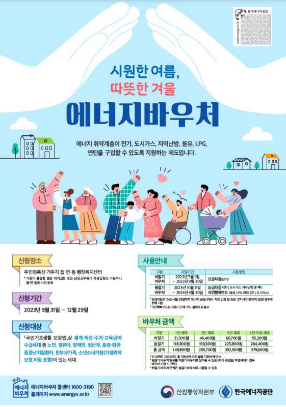 시원한 여름, 따뜻한 겨울 에너지바우처 2023년 12월 29일까지 신청하세요 – 신청 및 문의 : 주민등록상 거주지 읍/면/동 행정복지센터. – 지원내용: 전기, 도시가스, 지역난방, 등유, LPG, 연탄을