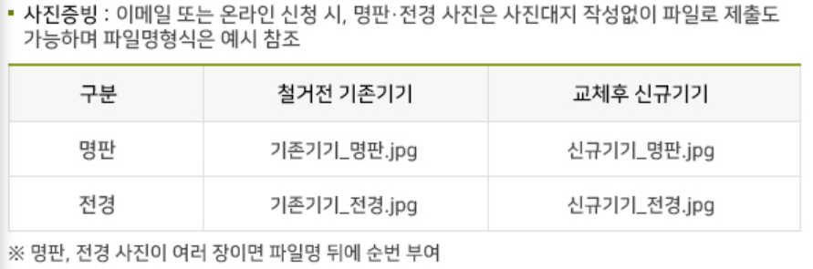 3) 명판, 전경사진(철거전 기존기기의 모델명, 제조일자 등을 확인할 수 있는 명판 사진 및 실제 기기 설치여부를 확인할 수 있는 전경사진)