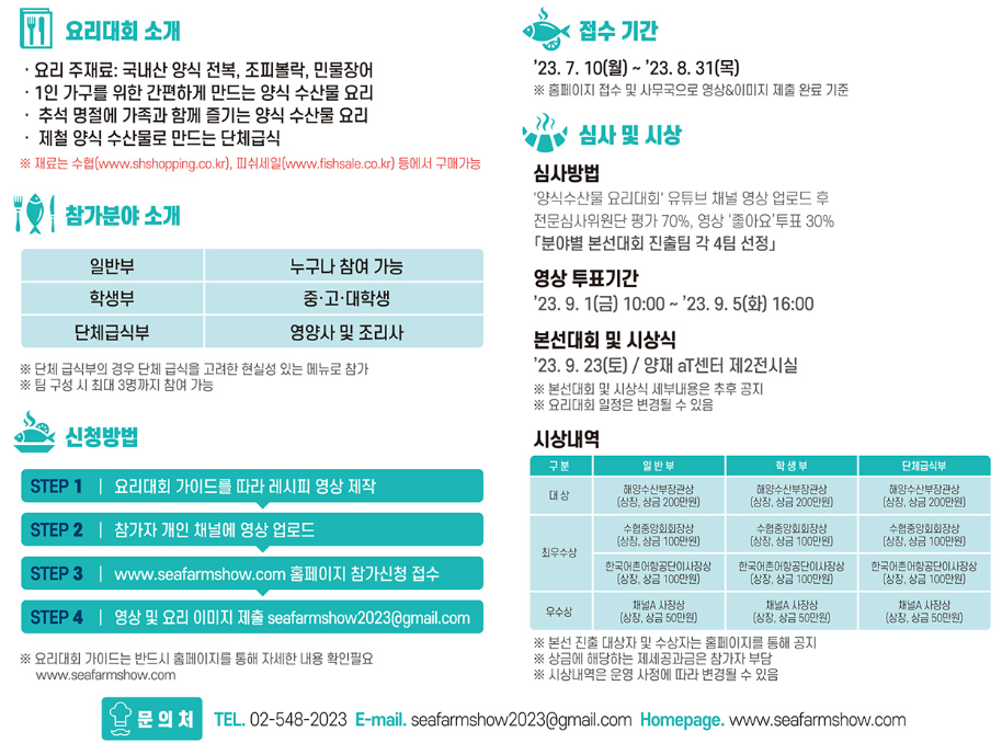 해양수산부에서는 동아일보, 채널A와 공동으로 9.22~24일(3일간) 서울 양재 aT센터 제2전시장에서 2023년 수산양식박람회를 개최합니다.