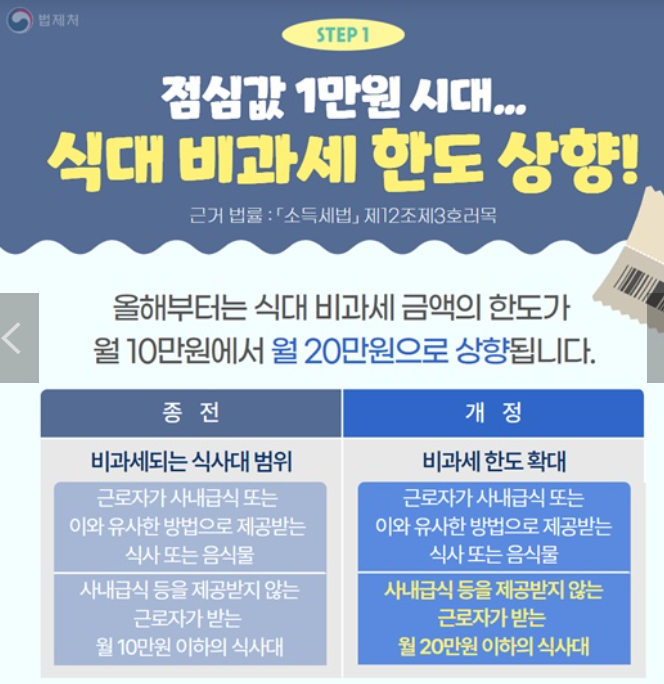 올해는 식대 비과세 금액의 한도가 월10만원에서 월20만원으로 상향됩니다.