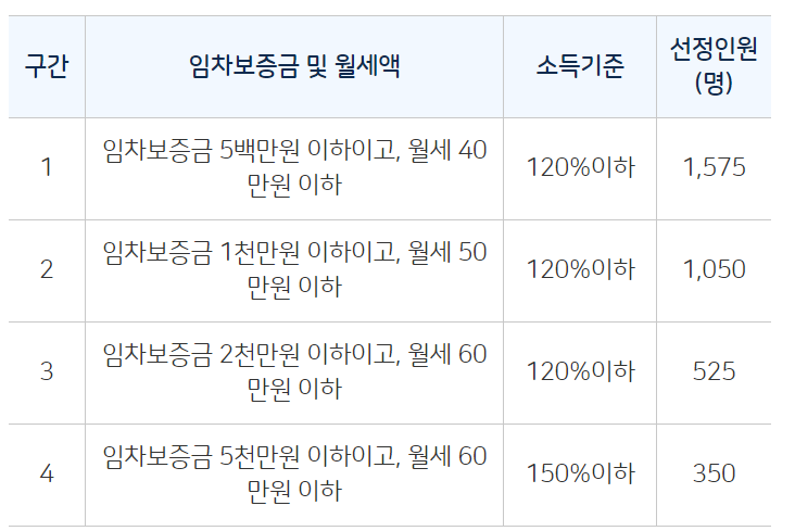 임차보증금, 월세 및 소득구간을 4개 구간으로 나누고 선정인원 초과 시 구간별 전산 무작위 추첨, 3500명 선정