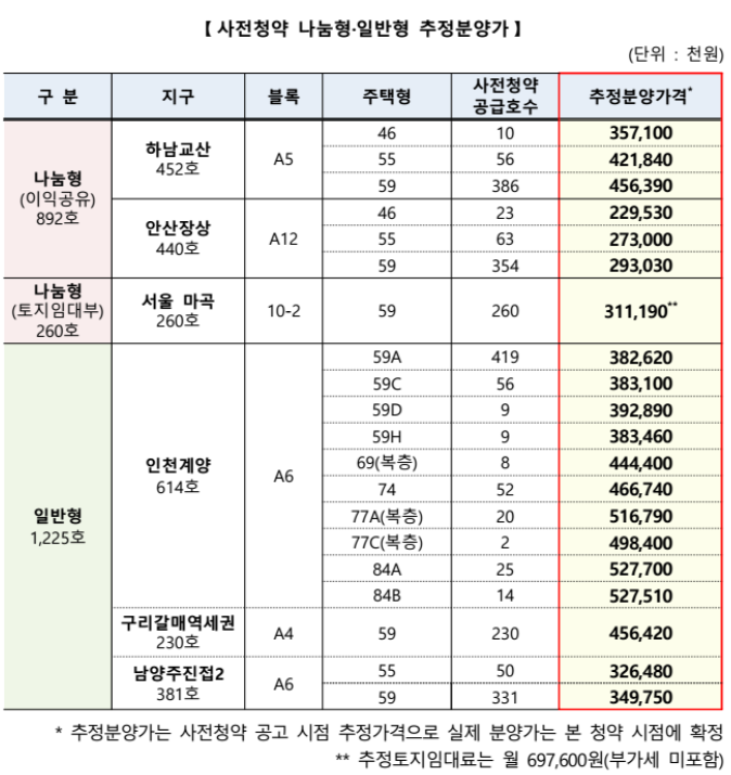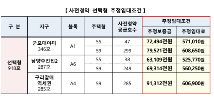 (선택형 분양가) 사전청약 공고시점 기준 추정감정가, 추정임대조건을 제공하며, 실제 입주 시 감정가와 임대조건은 본청약에서 공고되는 가격으로 확정