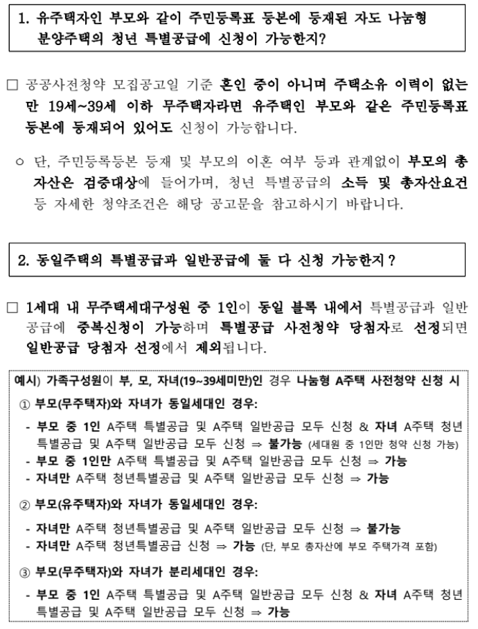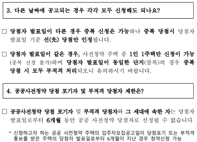 당첨자 발표일이 다른 공공사전청약에 중복 신청할 경우 먼저 발표된 당첨만 인정되며, 당첨자를 대상으로 자격 검증 등을 거쳐 최종당첨자 확정