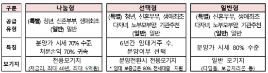 나눔형: 일반형 대비 저렴한 분양가로 공급하고 분양가의 80%까지 최대 40년간 저금리 모기지 지원, 의무거주기간 이후 사업시행자에게 환매가 가능하며 환매시 처분 손익의 70%를 수분양자에게 귀속하는 유형