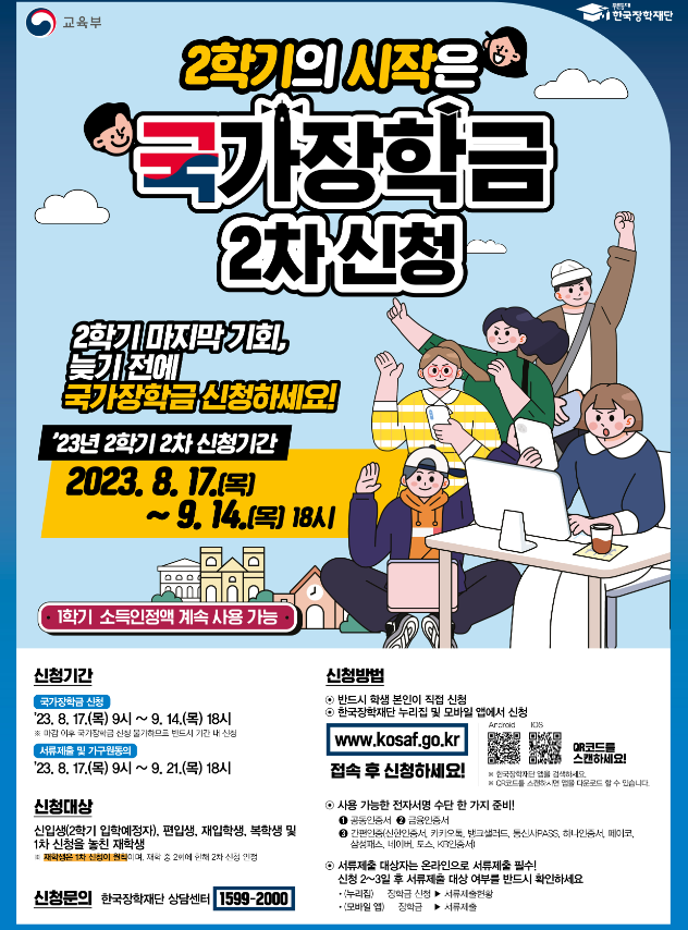 2023년 2학기 2차 국가장학금 신청방법, 신청대상, 신청기간 등에 대해서 알아보겠습니다. 2023년 2차뿐만 아니라 매년 국가장학금 내용은 신청방법, 서류 등이 비슷하거나 동일하오니 참조하시기 바랍니다.