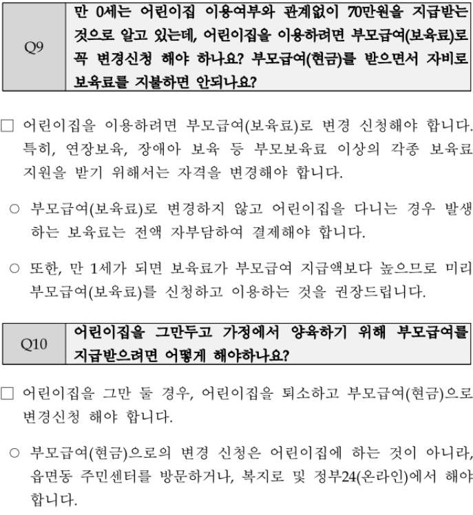 부모급여와 종일제 아이돌봄서비스비용은 중복으로 지급불가!!!(FAQ참조)
