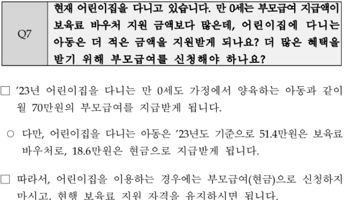* 어린이집을 이용하는 경우 만0세와 만1세모두 51만4,000원 보육료바우처를 지급받는 경우, 그 차액을 현금으로 받게됨