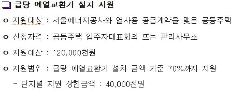 특히 준공이 35년 이상된 곳은 에너지 효율이 낮아 주민들이 부담이 증가하고 있는데요, 서울시에서는 노후된 중앙난방, 지역난방을사용하는 노후 공동주택의 난방 설치 교체지원금을 지원하니 아래 내용하여서 지원금 받으세요!(보조금 지급 예산 소진시 선착순이니, 지금 바로 묻지도 따지지도 말고 신청하세요~)