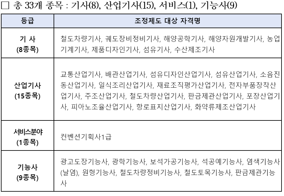 검정시행 조정제도 대상 종목(2024년 필기시험 미시행)