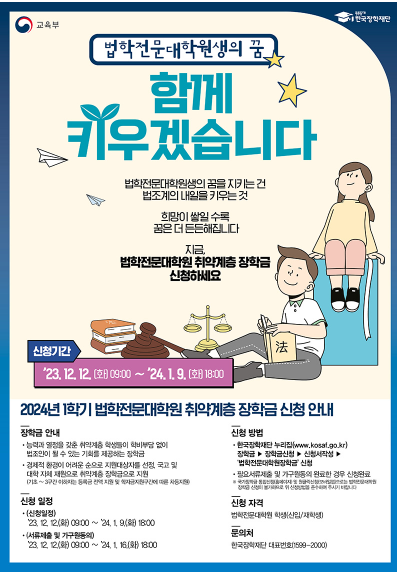 법전원 국가장학금은 능력과 열정을 갖춘 취약계층 학생들이 학비 부담없이 학업에 매진하고 법조인으로 진출할 수 있는 기회를 확대하고자 지난 2016년부터 소득구간 연계를 바탕으로 국가, 학교가 지원하는 장학금입니다.