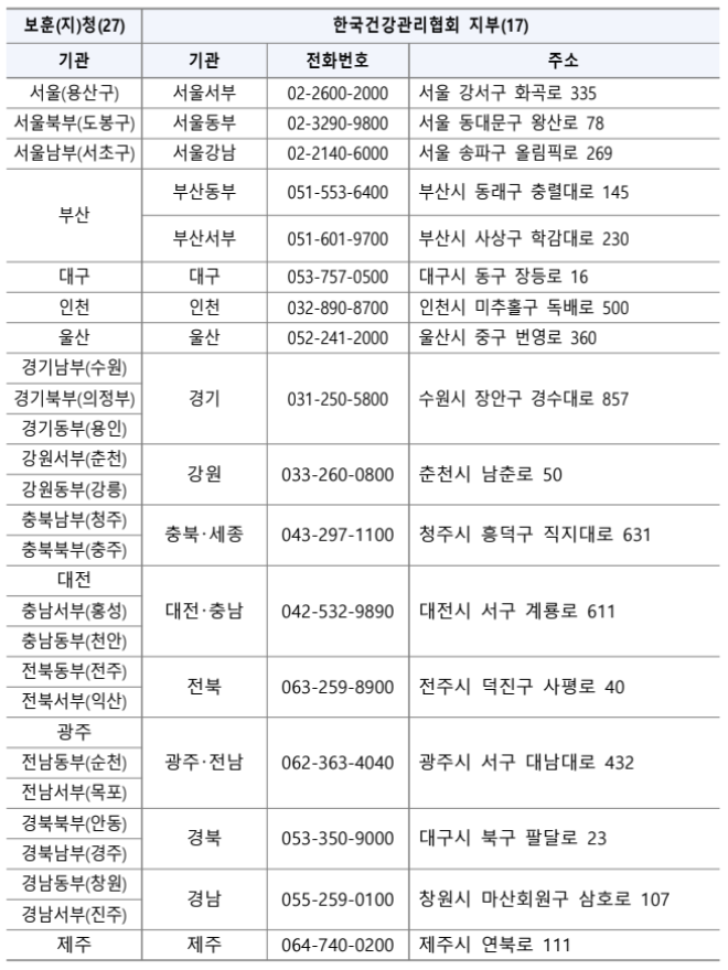 6월부터 2개월간 보훈가족들에 대한 무료 건강검진을 진행하며, 신청은 5월 1일부터 건강관리협회 각 지부에 전화로 신청하면 되니 아래의 지부 전화번호를 확인하시어 지금 바로 신청하시기 바랍니다.