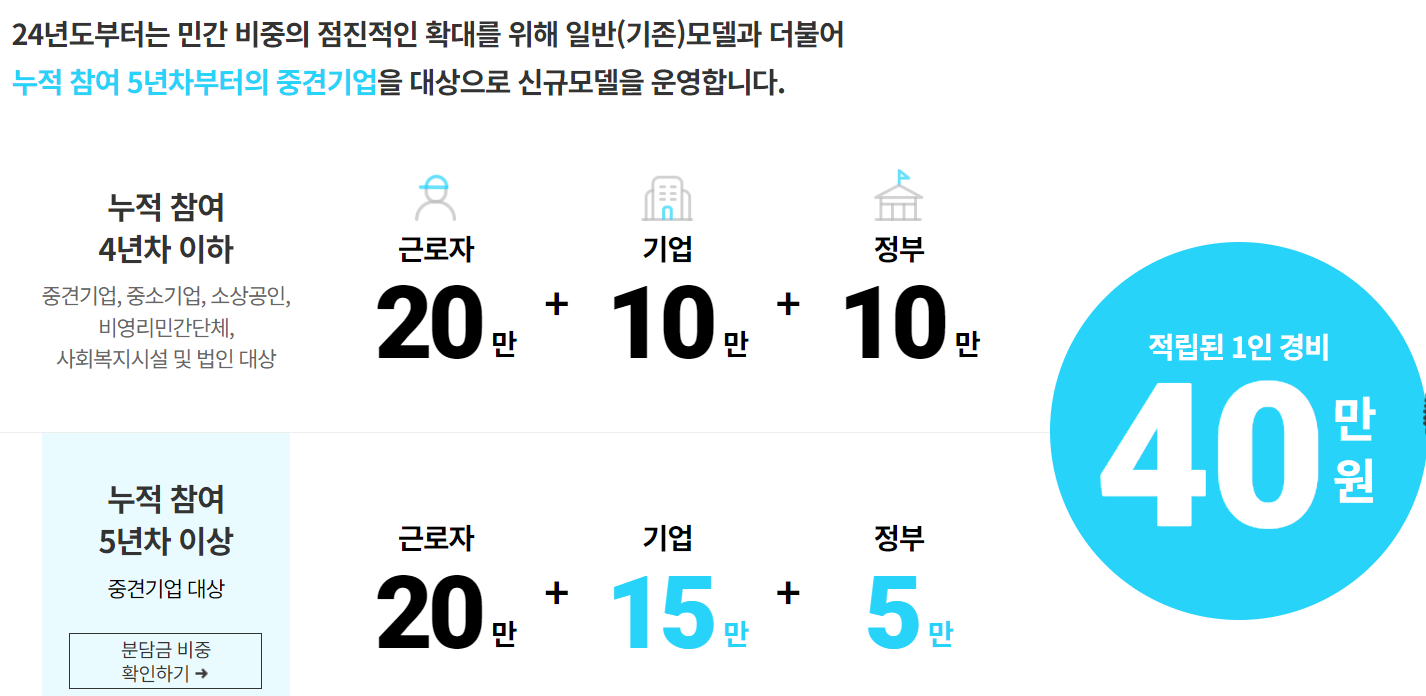 *(‘24년 기준 누적 참여 5년차 이상 중견기업) 정부 5만원, 기업 15만원, 근로자 20만원