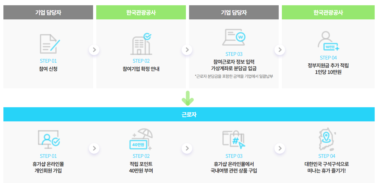 - (기업) 참여신청 → (공사) 참여기업 확정 → (기업) 기업/근로자 분담금 일괄 입금 및 근로자 정보 등 제출 → (공사) 정부지원금 추가적립 및 휴가샵 온라인몰에 40만원 포인트 부여 → (근로자) 휴가샵 온라인몰에서 포인트 사용