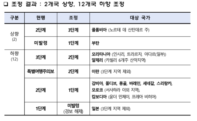 이와 함께, 스리랑카·몽골·세네갈 등은 치안 및 보건 상황 개선을 반영하여 2단계에서 1단계로 하향 조정한다. 다만, 콜롬비아 일부지역(노르테 데 산탄데르 주)은 중범죄 및 테러 발생 가능성을 고려하여 2단계에서 3단계로 상향 조정한다.