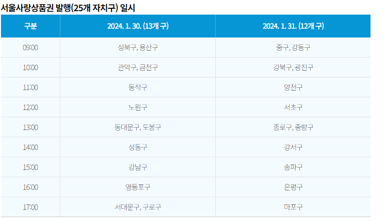 2024.1.30~1.31.양일간각 자치구마다 다르게 발행하니 아래의 표를 확인하세요