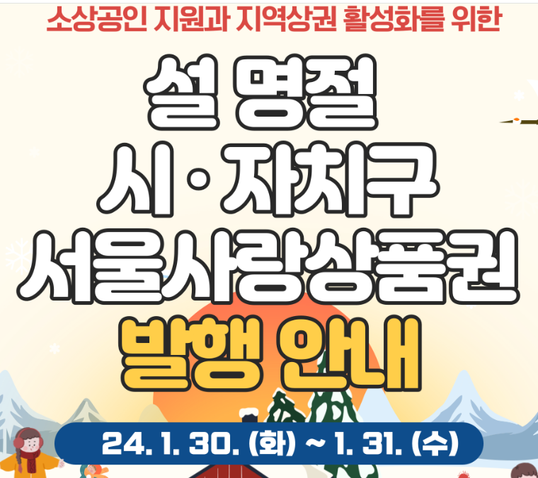 서울시에서 설날을 맞이하여 1,000억원 규모의 서울사랑상품권을 발행합니다. 2024.1.30.일부터 31까지 양일간 25개 자치구에서 지역상품권을 발행한다고 하니 해당 자치구에 속한 일자를 확인하여 꼭 구매하시기 바랍니다.