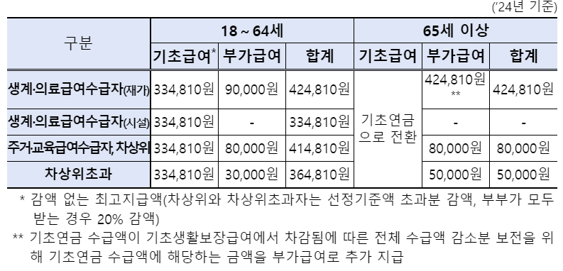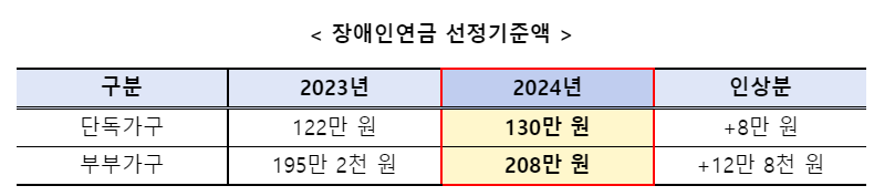 (선정기준액) 2024년 단독가구 130만원, 부부가구 208만원 이하
