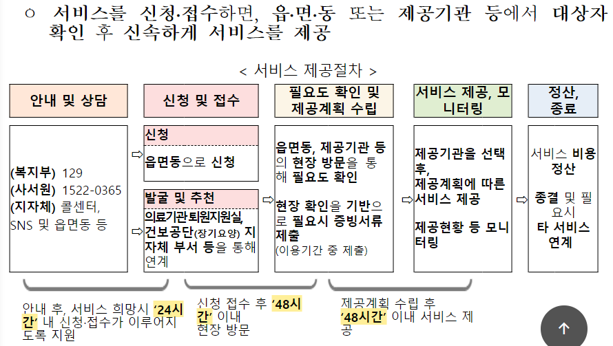 현장 방문 및 확인을 거쳐 긴급성(한시성), 돌봄 필요성, 보충성(他 서비스 이용자는 제외) 요건을 확인 후 제공
