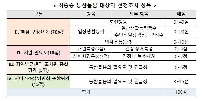 ①도전행동이 심하고,일상생활 수행능력과의사소통능력에 심각한 제약이 있으며, ②개인 및 사회환경 특성에 따른 지원 필요도도 강해서 통합돌봄이 필요한 발달장애인