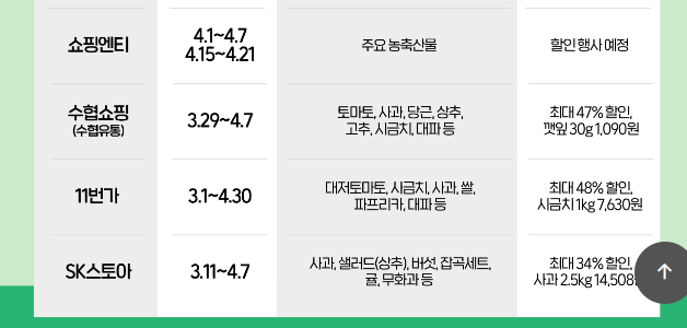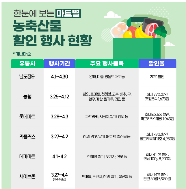 3월 25일부터 4월 12일까지 주요 농축산물에 대해 최대 70%까지 할인된 가격에 판매 중이다.