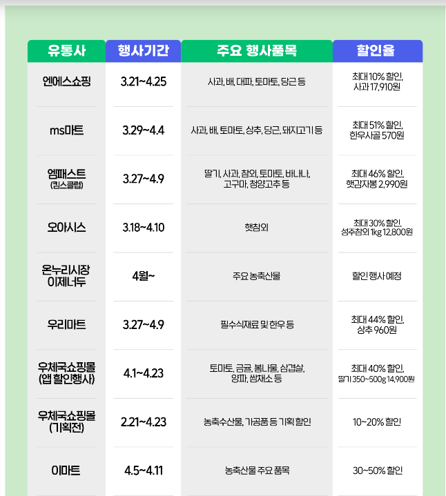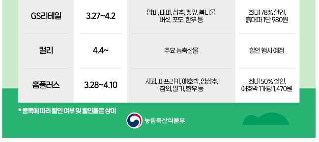 3월 25일부터 4월 12일까지 주요 농축산물에 대해 최대 70%까지 할인된 가격에 판매 중이다.