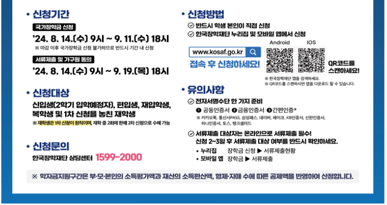 한국장학재단은 8월 14일(수)부터 9월 11일(수)까지 2024학년도 2학기 2차 국가장학금 신청을 받는다고 합니다.