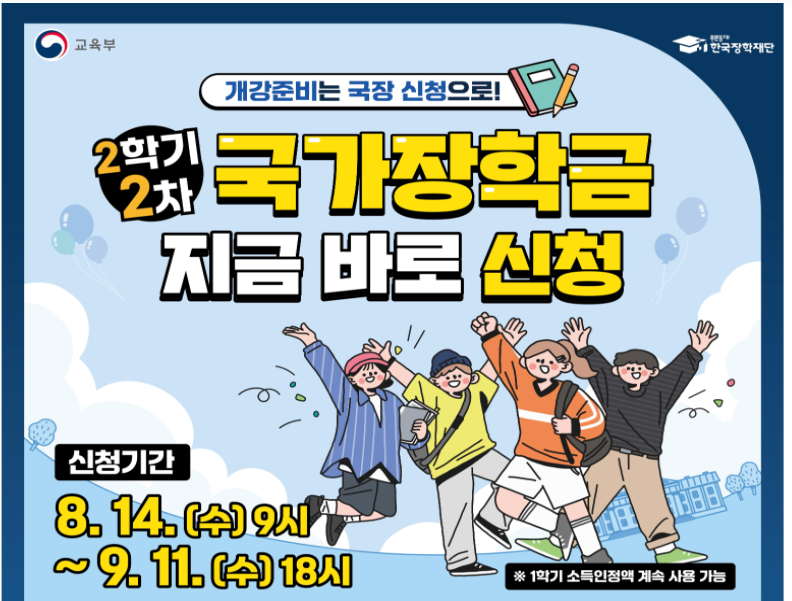 한국장학재단은 8월 14일(수)부터 9월 11일(수)까지 2024학년도 2학기 2차 국가장학금 신청을 받는다고 합니다.
