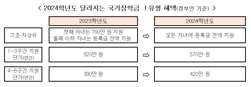 2024학년도부터는 기초생활수급자, 차상위계층의 모든 자녀에게 등록금 전액 지원하며, 학자금 지원 1~3구간의 지원 단가를 2023년 대비 50만원, 4~6구간의 지원단가를 30만 원 인상